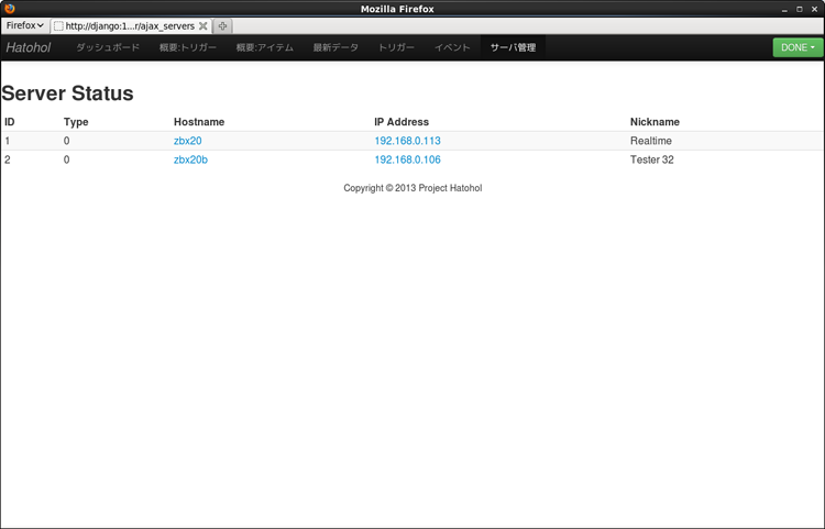 HatoholのServers画面