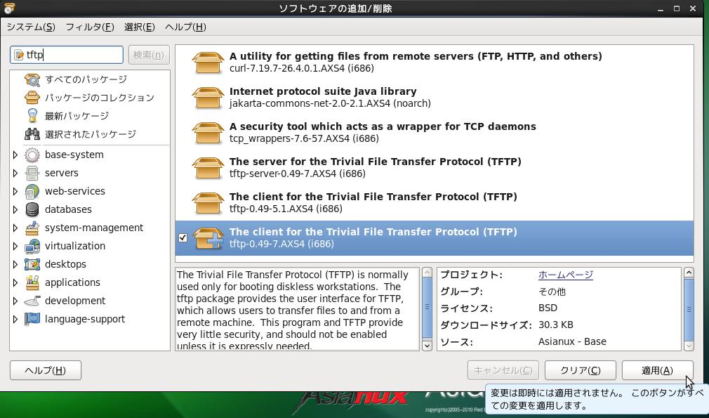 GUI ツールの使用方法:パッケージを選択し「適用 (A)」