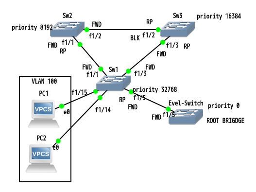 これまでなら、Bridge priority が 0 の Evil-Switch が ROOT BRIDGE になるはずです。